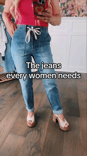 These jeans have a functional drawstring waist, button and zip closure! They're a true jean with so much style jam packed into them.